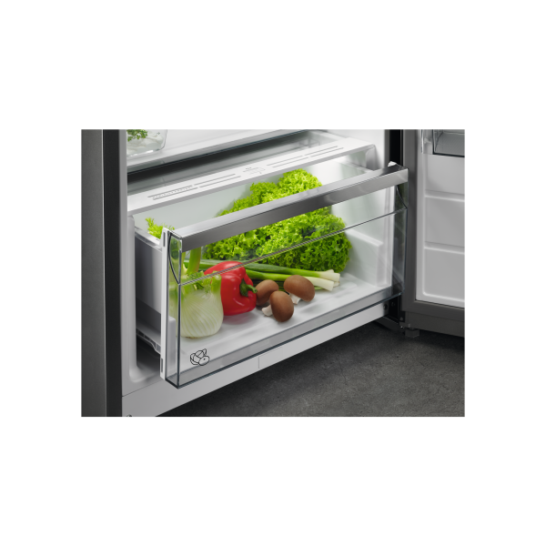 Die Gemüseschublade dieses Kühlschranks ist mit speziellen Lüftungsöffnungen ausgestattet, mit denen Sie den Feuchtigkeitsgrad im Inneren genau steuern können. Obst und Gemüse werden jetzt mit der richtigen Feuchtigkeit geschützt.