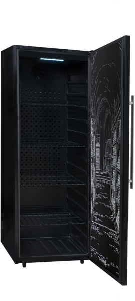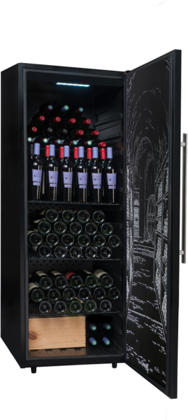 Premium-Mehrzweck-Weinkeller PCLP205: Entdecken Sie dieses Modell mit einer Volltür, um Ihren Flaschen maximale Dunkelheit zu bieten und ihnen eine Reifung unter besten Bedingungen zu garantieren. Lagerkapazität von 204 Flaschen in der Standardkonfiguration. Wird mit 3 festen Böden, 1 festen Halbboden und 1 Metallplatte geliefert, um Ihre offenen Flaschen aufrecht zu halten.