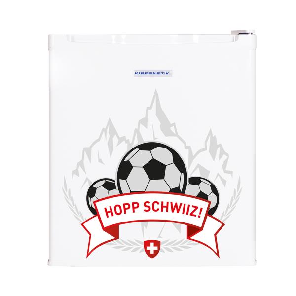 Der Hopp Schwiiz Kühlschrank mit einem Abbild der Schweizer Berge ist ein völliges Unikatstück & so in dieser Art einzigartig in der Schweiz.