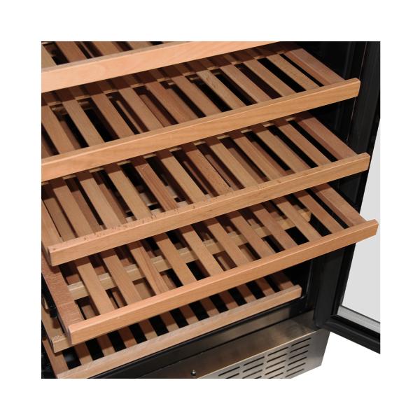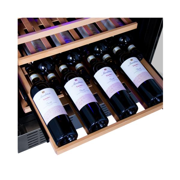 Schön präsentiert auf ausziehbaren Regalen aus edlem Buchenholz und dank der LED-Beleuchtung ins richtige Licht gerückt - Ihre Weine werden bestens umsorgt.