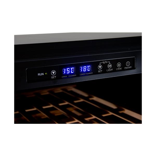 Der freistehende Weinschrank verfügt über zwei identisch einstellbare Temperaturzonen (3 - 20 °C), die jedoch unterschiedlich gross sind.