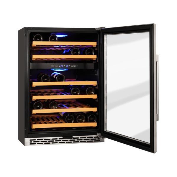 Der Weinklimaschrank verfügt über ein pulverbeschichtetes Gehäuse und ausziehbare Regale aus edlem Buchenholz.