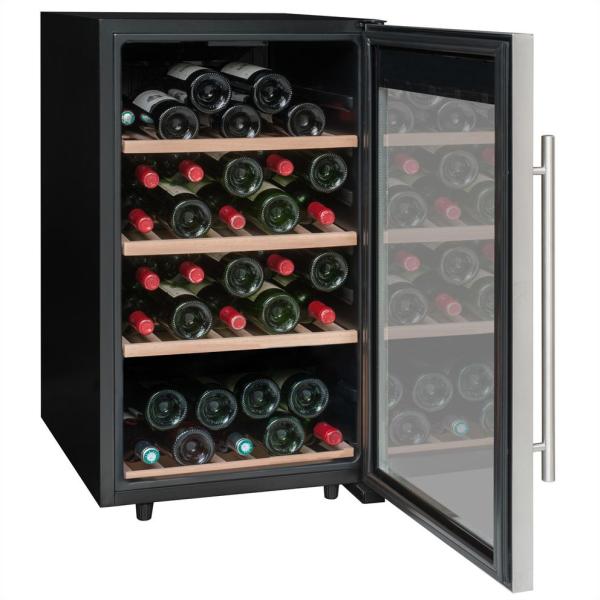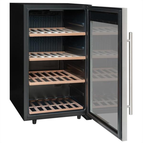 Weinschrank LS52A zum Temperieren von bis zu 52 Flaschen. Der formschöne Weinschrank mit Glastür mit UV-Schutz wird mit 3 festen Ablagerosten und 1 halbem Rost aus Buchenholz geliefert.