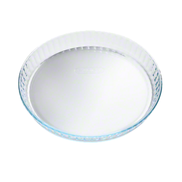 Runde Glasschale bzw. Tortenbodenform zum Backen oder als Fettpfanne zum Braten.