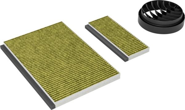 Bestehend aus 2 Clean Air Plus Aktivkohlefiltern und einem Diffusor für einen Betrieb ohne Kanal.