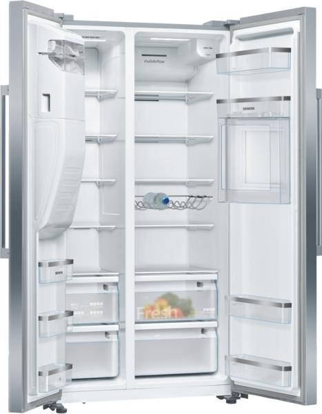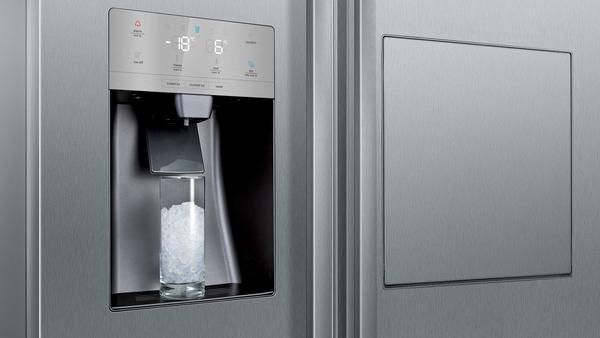 Aus dem integrierten Eisbereiter im Gefrierfach bekommen Sie auf Wunsch Eiswürfel oder Crushed Ice, während im Kühlschrank immer erfrischend kühles, gefiltertes Wasser auf Sie wartet – dank Anschluss an die Wasserversorgung.