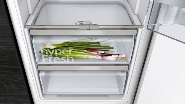 coolEfficiency Einbau-Kühlschrank mit hyperFresh plus Box für bis zu 2 mal längere Frische bei Obst und Gemüse und flexiblem varioShelf.
