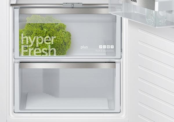 coolEfficiency Einbau-Kühlschrank mit hyperFresh plus Box für bis zu 2 mal längere Frische bei Obst und Gemüse, flexiblem varioShelf und softClosing Tür.