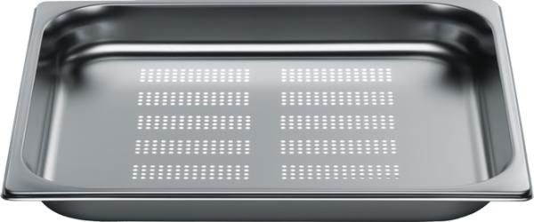 Garbehälter aus pflegeleichtem Chromstahl. Zum Garen von Gemüse oder zum Auftauen von Tiefgefrorenem. Überschüssige Flüssigkeit und Saft fliesst durch die Löcher ab.